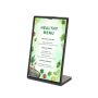 Presenteer jouw menu, prijzen of informatie op de Scritto® Menustandaard. Een tafelstandaard gemaakt van duurzaam polypropyleen met een eenvoudige plaatsing van de content via de achterzijde. Verander jouw content snel en eenvoudig. Verkrijgbaar in zwart en wit en in T-vorm of L-vorm. Ideaal te gebruiken in wachtkamers of bij receptiebalies in openbare ruimtes, in de retail of in de horeca.