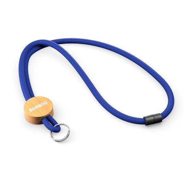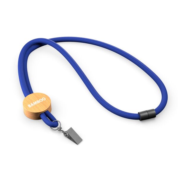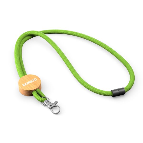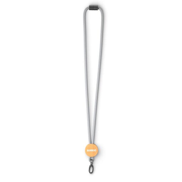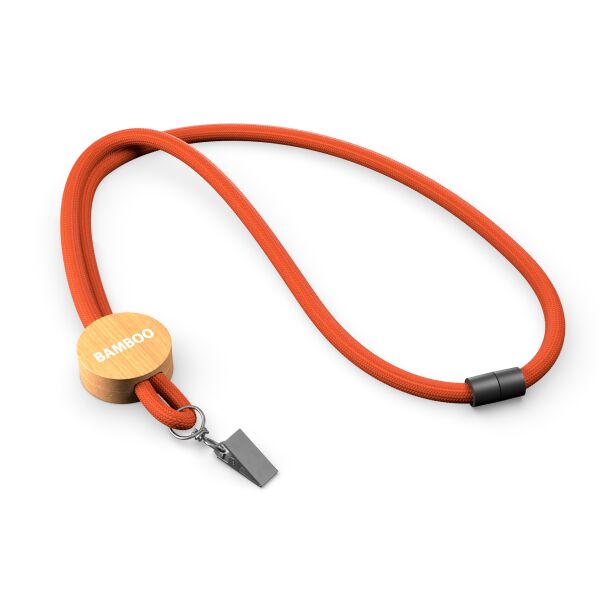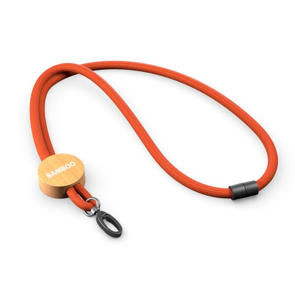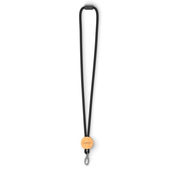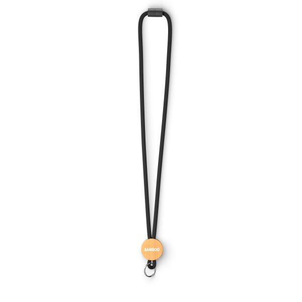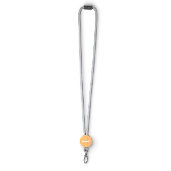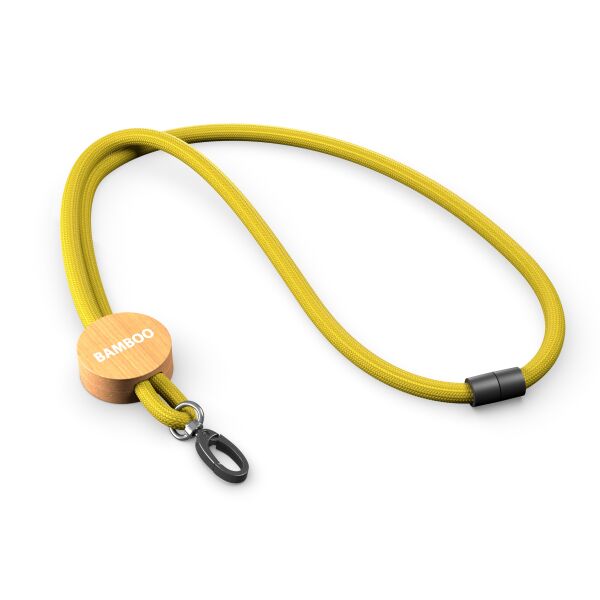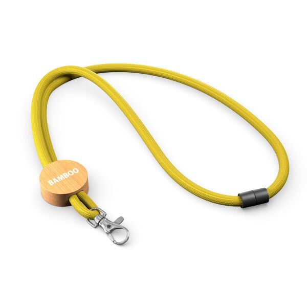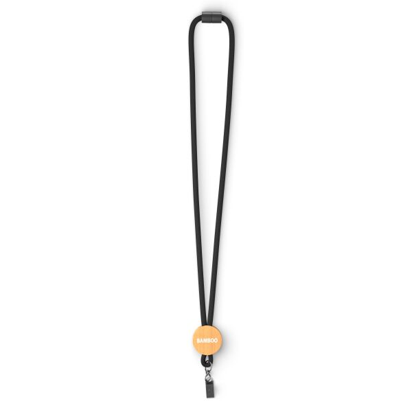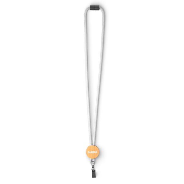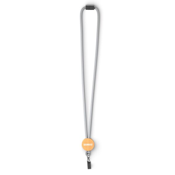 Polyester koordlanyard met een ronde bamboe plaat met bedrukking of gravure. Afmetingen: 0,6 cm diameter × ca. 92 cm lengte.