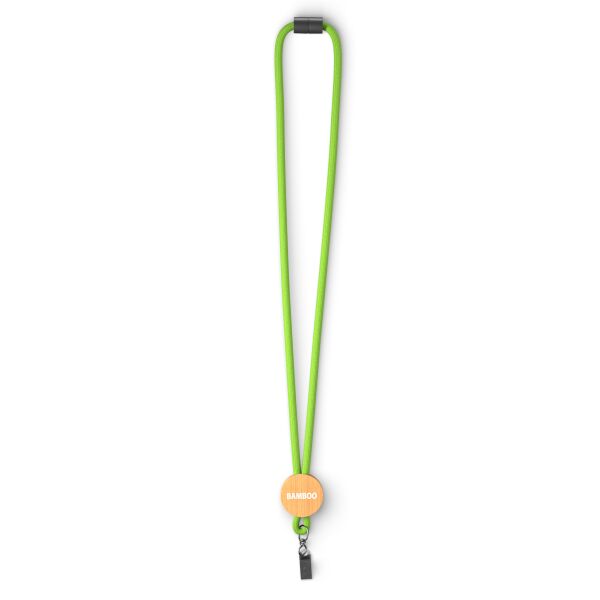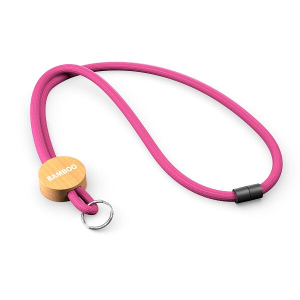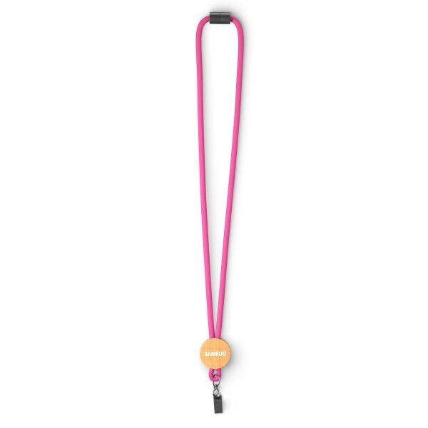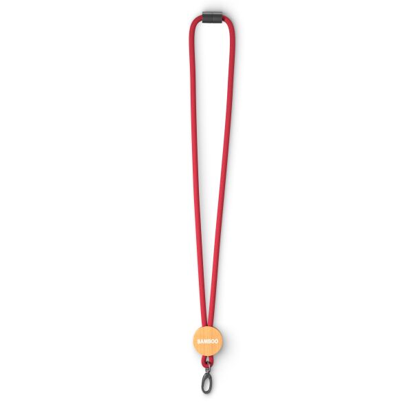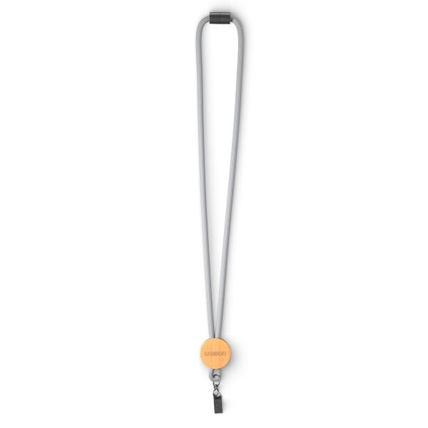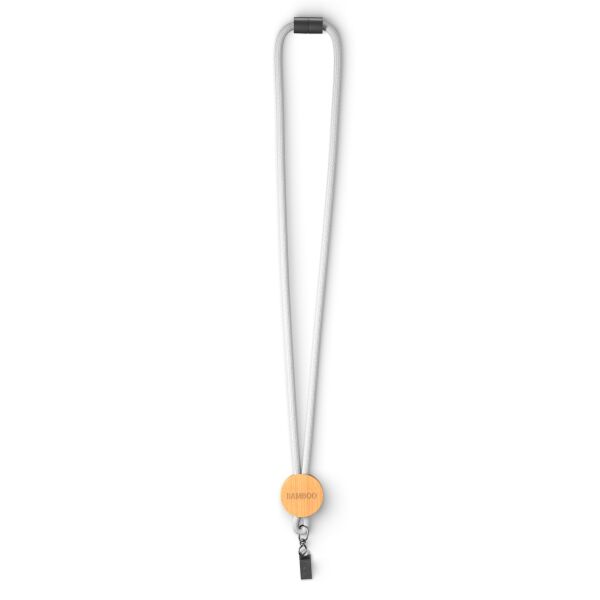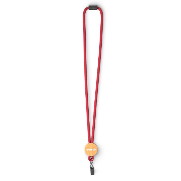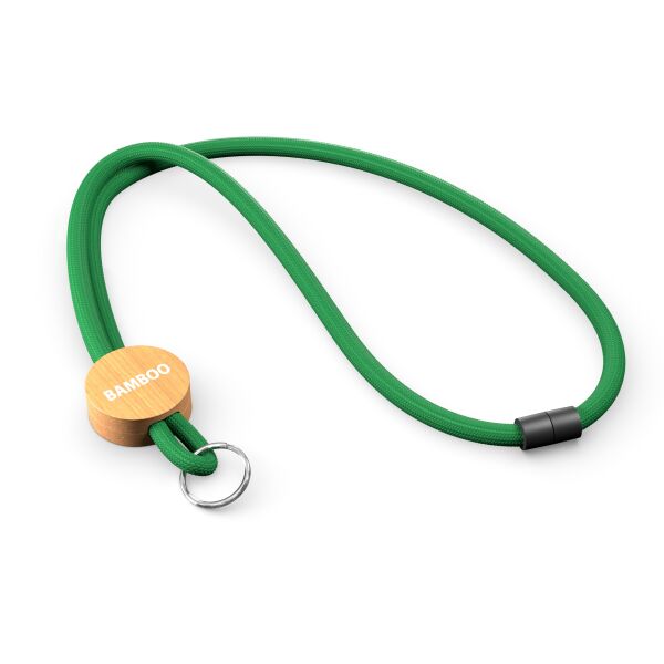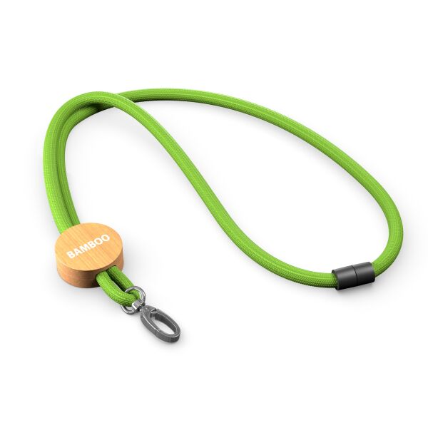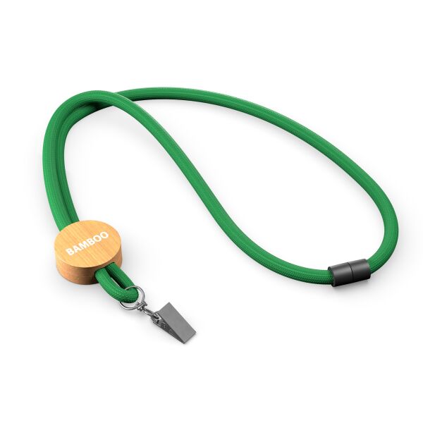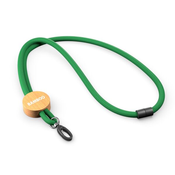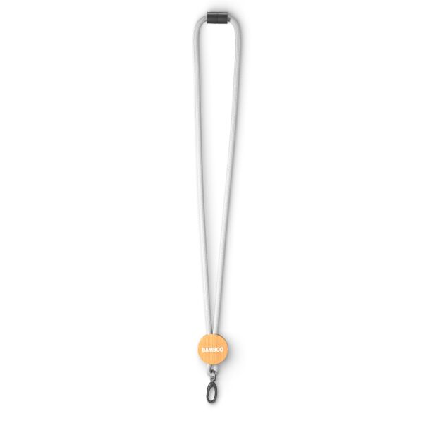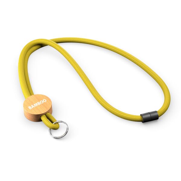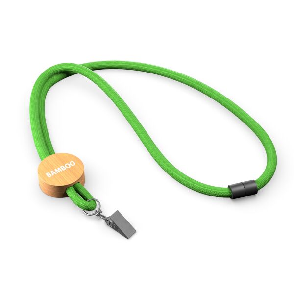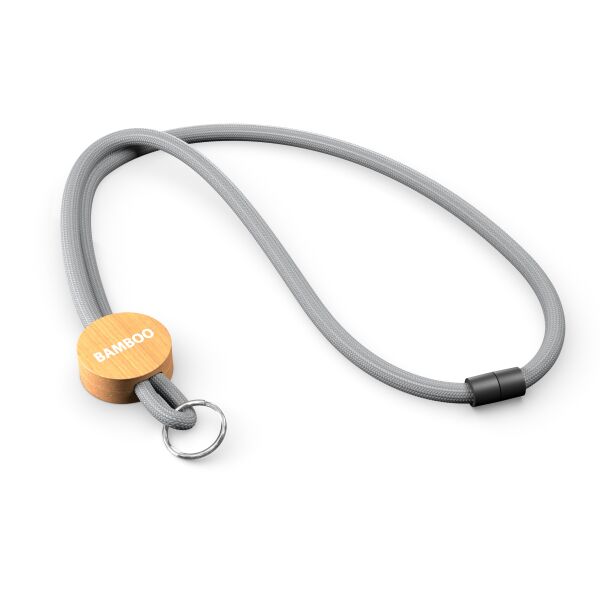 Polyester koordlanyard met een ronde bamboe plaat met bedrukking of gravure. Afmetingen: 0,6 cm diameter × ca. 92 cm lengte.