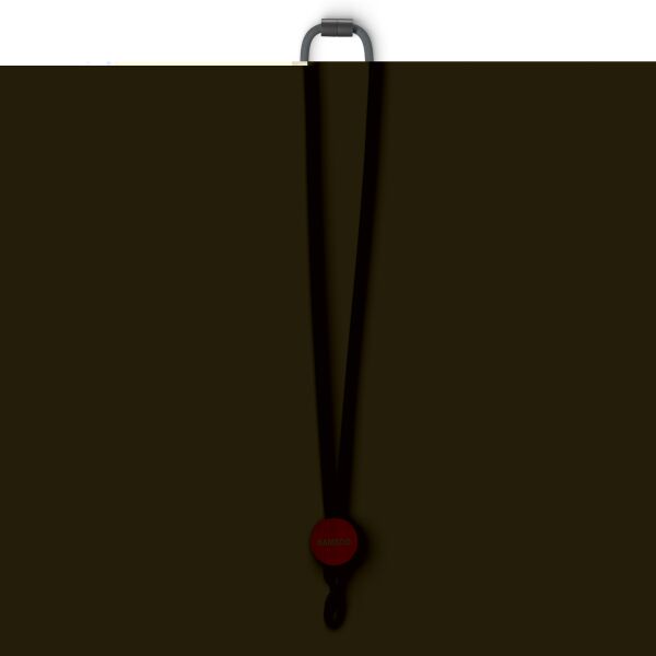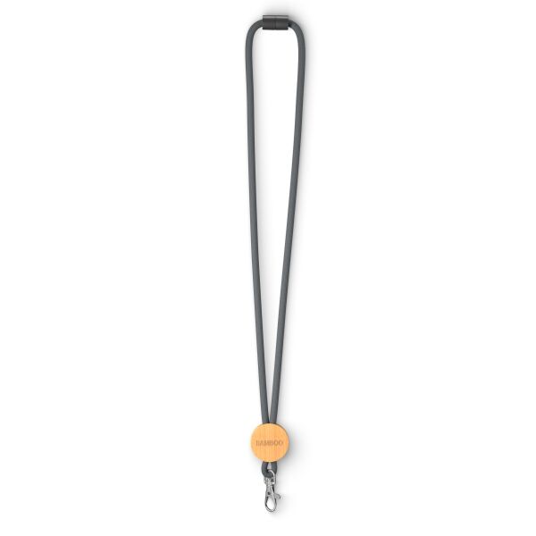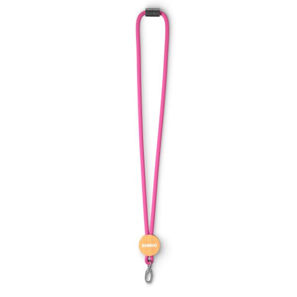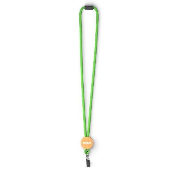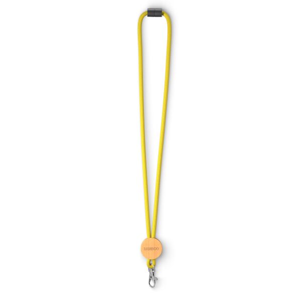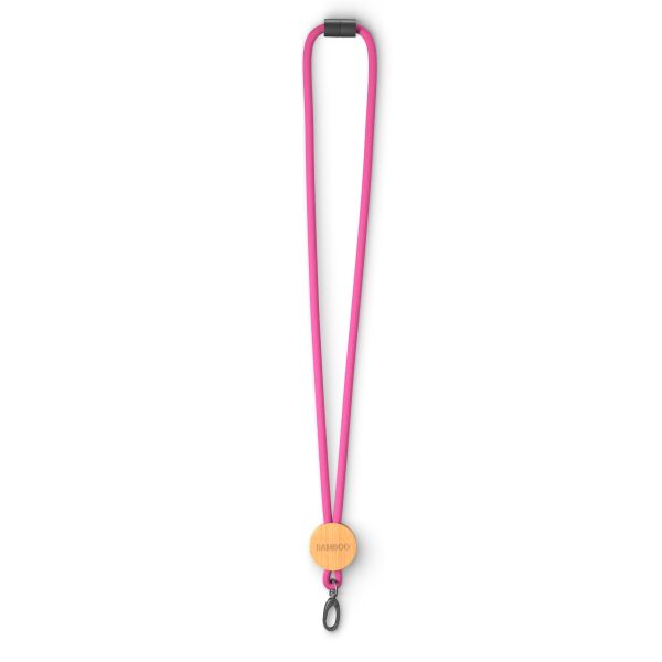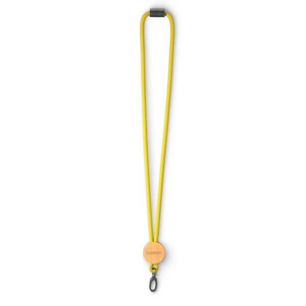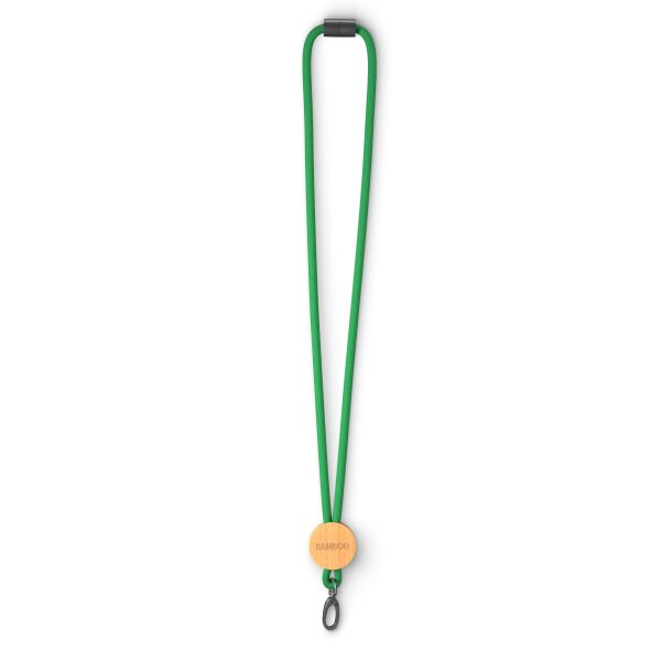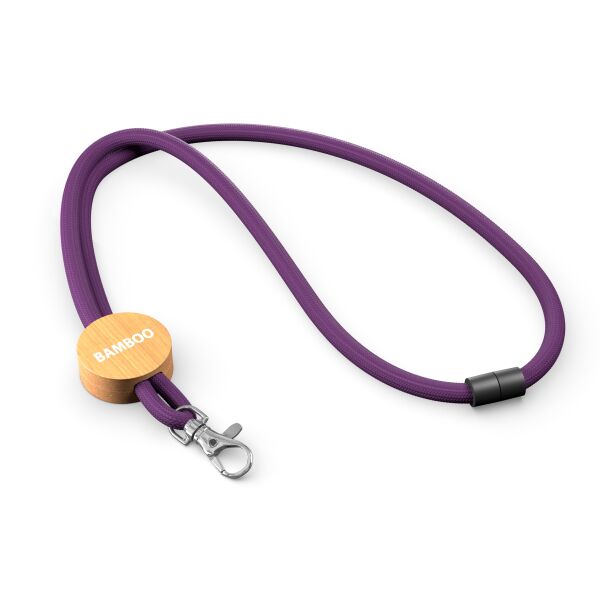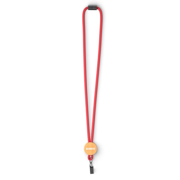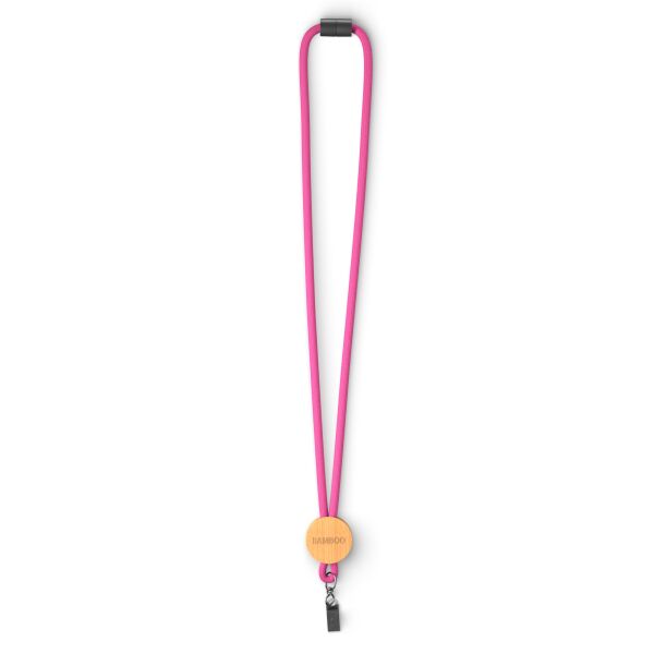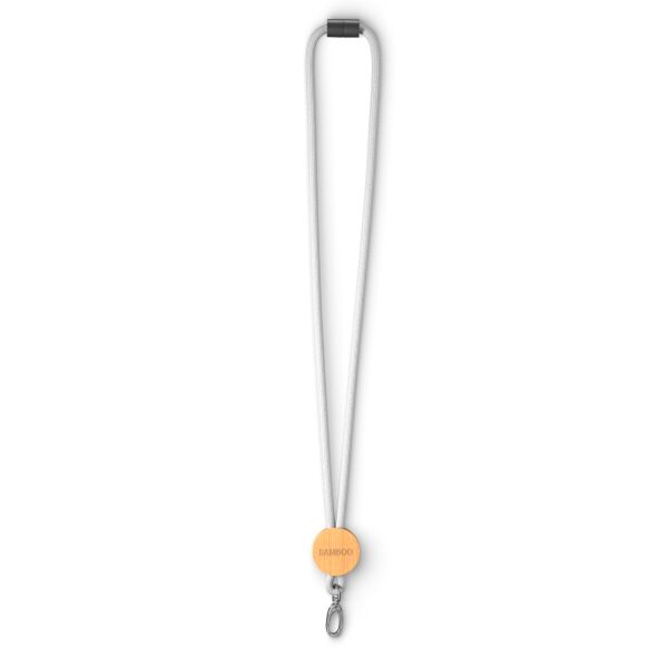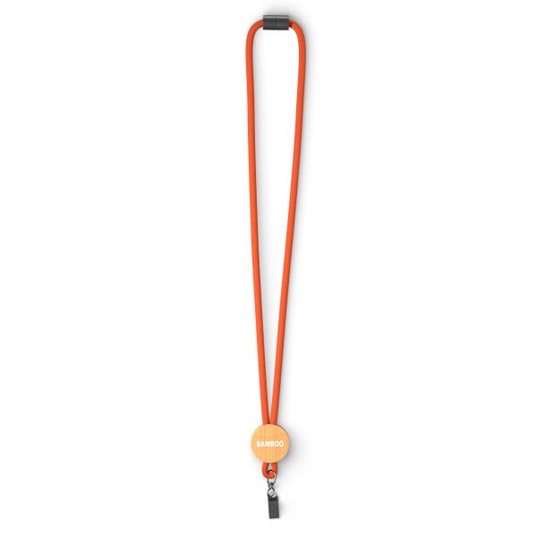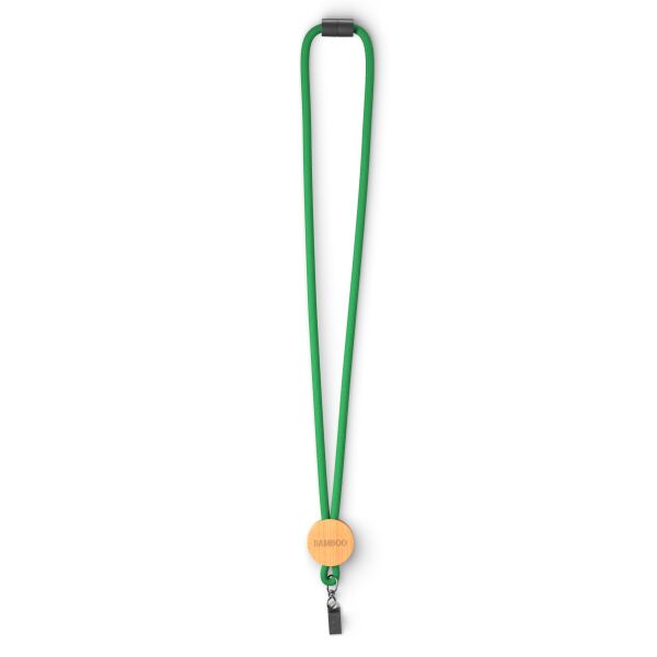Polyester koordlanyard met een ronde bamboe plaat met bedrukking of gravure. Afmetingen: 0,6 cm diameter × ca. 92 cm lengte.
