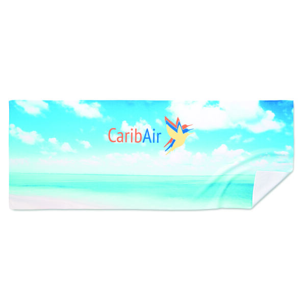 100% RPET koelhanddoek (140 gsm). Activeer door nat te maken met water en uit te zwaaien. Afmetingen: 80 × 30 cm of 100 × 30 cm.
