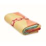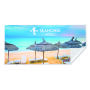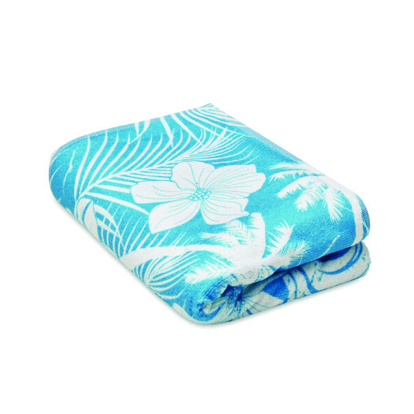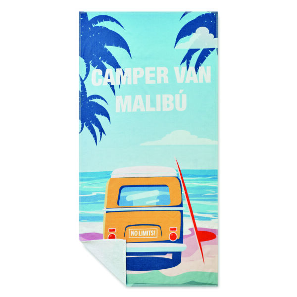 Full‑colour bedrukte strandhanddoeken gemaakt van 50% polyester en 50% katoen. De voorzijde van velours polyester wordt full‑colour bedrukt en heeft een zachte structuur. De achterzijde bestaat uit witte katoenen badstof voor optimale absorptie.
