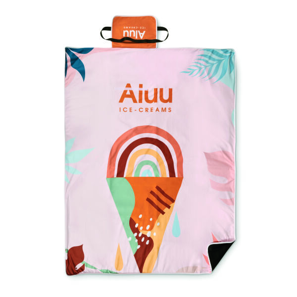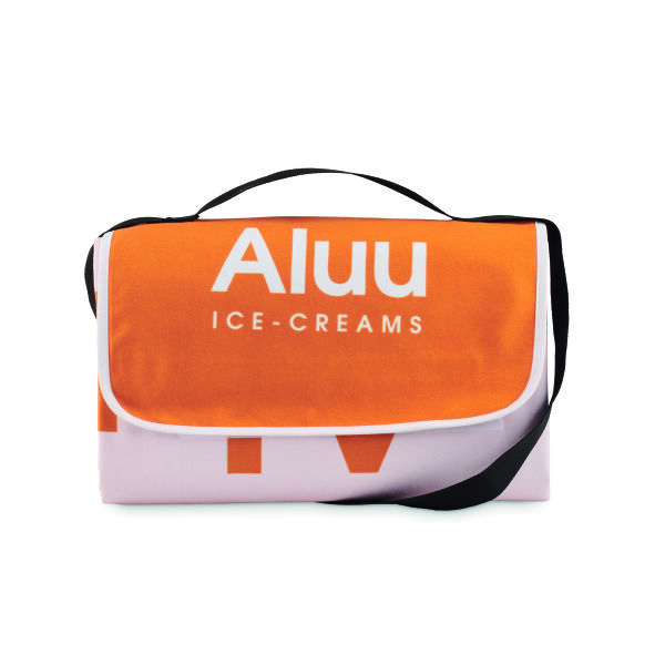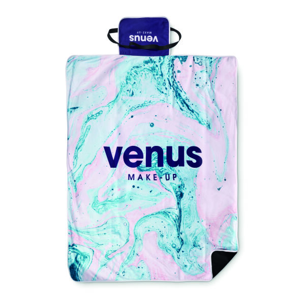 Full‑colour bedrukte opvouwbare picknickdeken. Gemaakt van 100% polyester fleece (220 gsm) met aan de onderzijde zwarte non‑woven stof van 80 gsm. Afmetingen: 120 × 150 cm of 130 × 170 cm.
