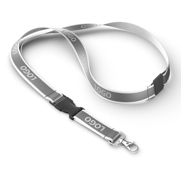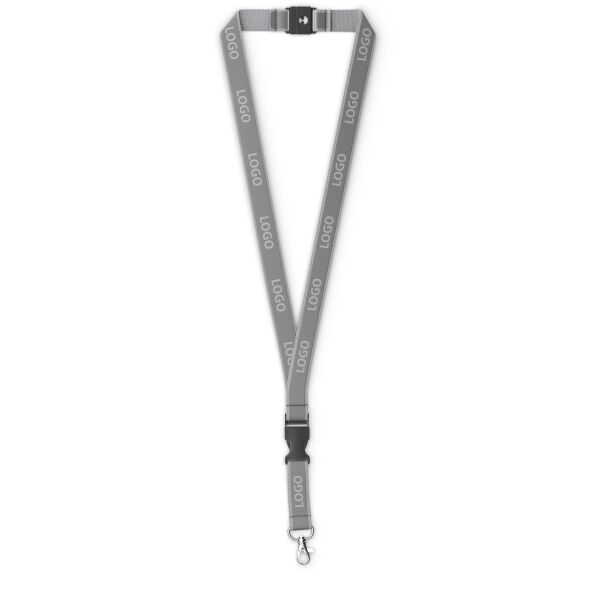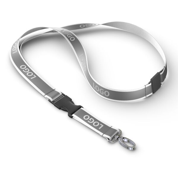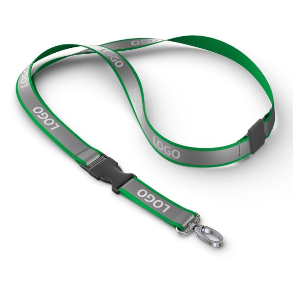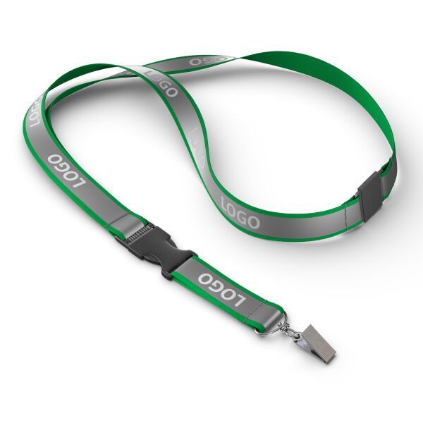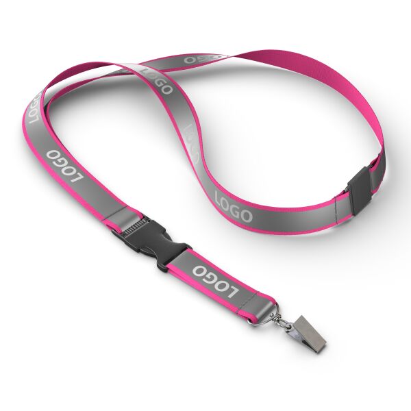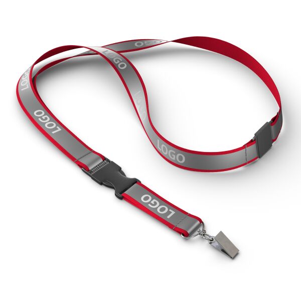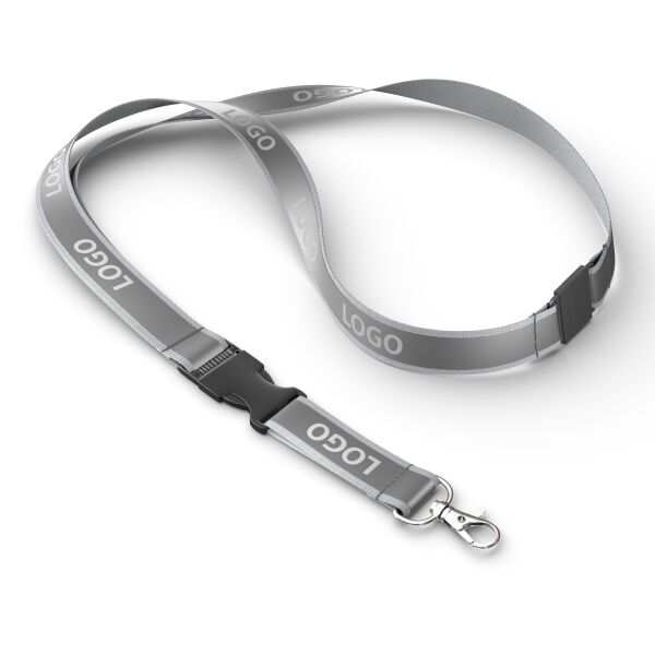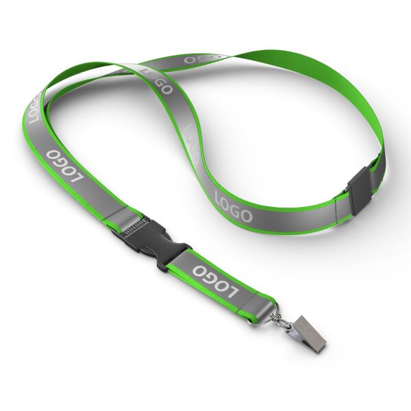 Blijf georganiseerd en stijlvol met deze afneembare lanyard in jouw ontwerp, voorzien van een stevige clip voor eenvoudige toegang tot je ID‑kaart of sleutels. Gemaakt van polyester met een grijze reflecterende overlay en een metalen karabijnhaak, of kies uit een van de andere clipopties. De reflecterende laag op het polyester lint van ca. 80 + 12 cm wordt aan één zijde bedrukt met jouw Pantone‑kleurige logo‑ontwerpen.