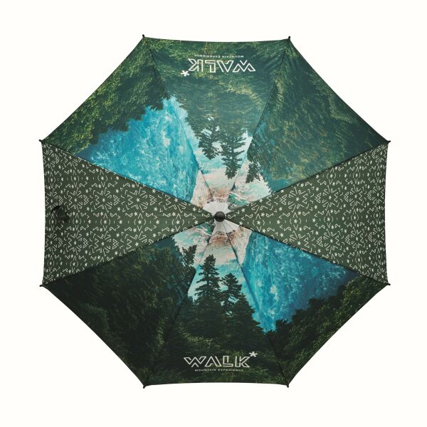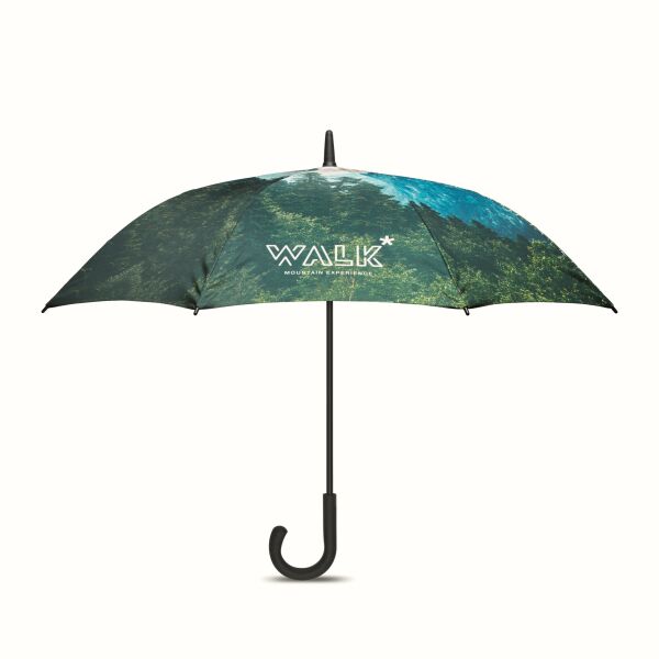 Premium windbestendige paraplu van 23 inch (Ø 102 cm) met zwart gecoate metalen steel en glasvezel baleinen. Kunststof punten, automatische opening en rubberen haakhandgreep. Deze paraplu combineert functionaliteit met een groot bedrukbaar oppervlak voor jouw unieke full‑colour (foto‑afbeelding) ontwerp. Alle 8 panelen zijn rand‑tot‑rand te bedrukken met levendige kleuren, zichtbaar aan de binnenzijde.