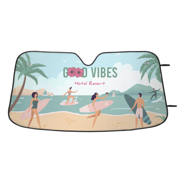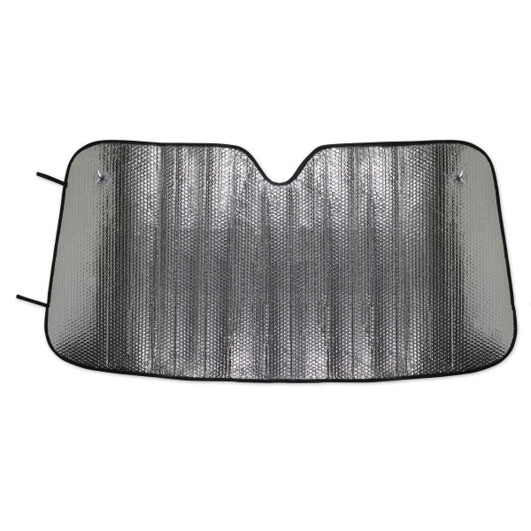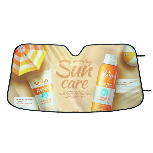 Autozonnescherm met jouw full‑colour all‑over ontwerp. Afmetingen: ca. 140 × 70 cm. Materiaal: 300D polyester met PU‑coating + 2 lagen aluminium bubbelfolie (totaal 4 mm). Verpakking: 1 zonnescherm + 2 transparante PVC zuignappen (Ø 4,5 cm) verpakt in een polybag.